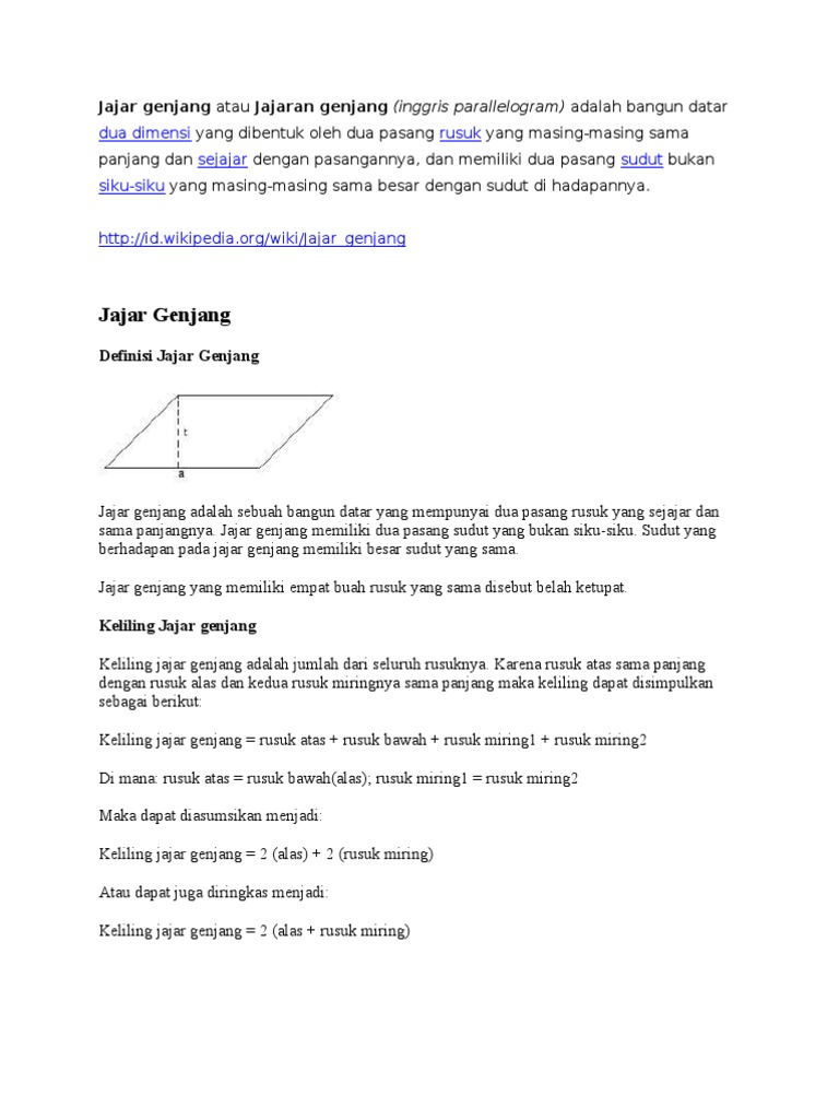 Ajar genjang atau jajaran genjang adalah bangun datar dua dimensi yang dibentuk oleh dua pasang rusuk yang masing-masing sama panjang dan sejajar dengan pasangannya serta memiliki dua pasang sudut yang masing-masing sama besar dengan sudut di hadapannya. Sifat Bangun Datar Jajar genjang. Sifat-sifat jajar genjang diantaranya yaitu.